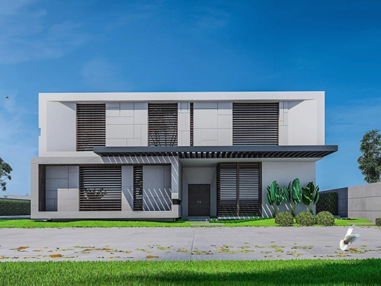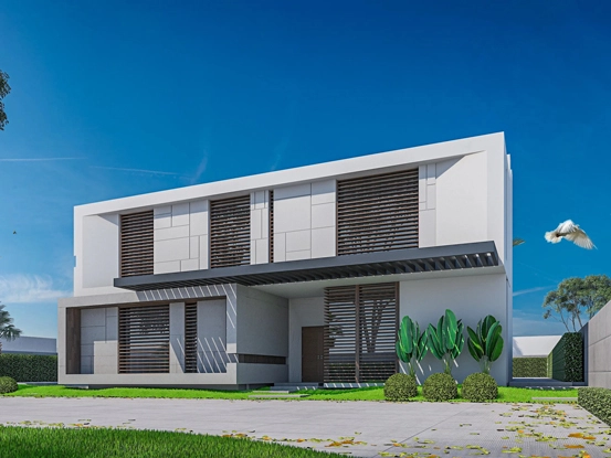 The Modern Luxury Villa with Pool in Sharjah is designed as a seamless blend of contemporary elegance and functional living. The clean geometric lines, expansive glass facades, and natural material finishes give the villa a sleek and timeless appeal. Outdoor spaces are carefully integrated, with a private pool and landscaped surroundings that extend the living experience beyond the interiors. Floor-to-ceiling windows create openness while maximizing natural light, while the poolside design adds a resort-like ambiance to the residence. Through modern architectural solutions and advanced 3D visualization, the villa delivers a perfect balance between luxury, comfort, and innovative design.
