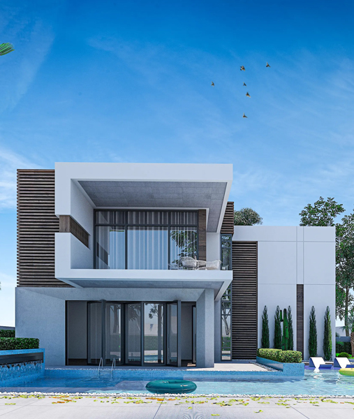 The Modern Luxury Villa with Pool in Sharjah is designed as a seamless blend of contemporary elegance and functional living. The clean geometric lines, expansive glass facades, and natural material finishes give the villa a sleek and timeless appeal. Outdoor spaces are carefully integrated, with a private pool and landscaped surroundings that extend the living experience beyond the interiors. Floor-to-ceiling windows create openness while maximizing natural light, while the poolside design adds a resort-like ambiance to the residence. Through modern architectural solutions and advanced 3D visualization, the villa delivers a perfect balance between luxury, comfort, and innovative design.