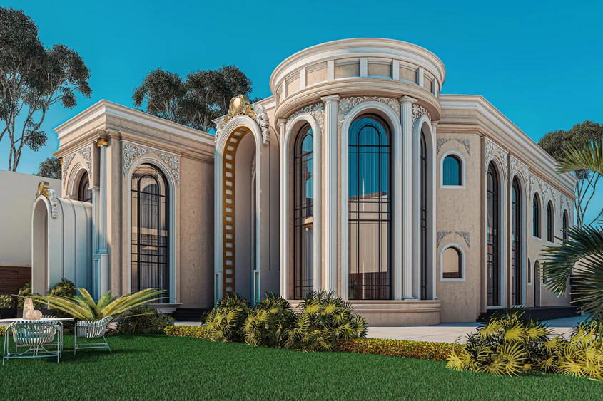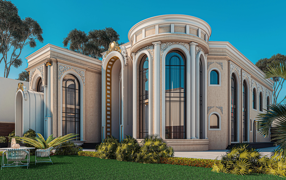 This villa project embodies a seamless blend of classical grandeur and contemporary elegance. Featuring tall arched windows, ornate detailing, and grand columns, the design reflects timeless luxury while ensuring modern functionality. The harmonious integration of architecture, landscaping, and 3D visualization brought the client’s vision to life, creating a space that is both impressive and livable.