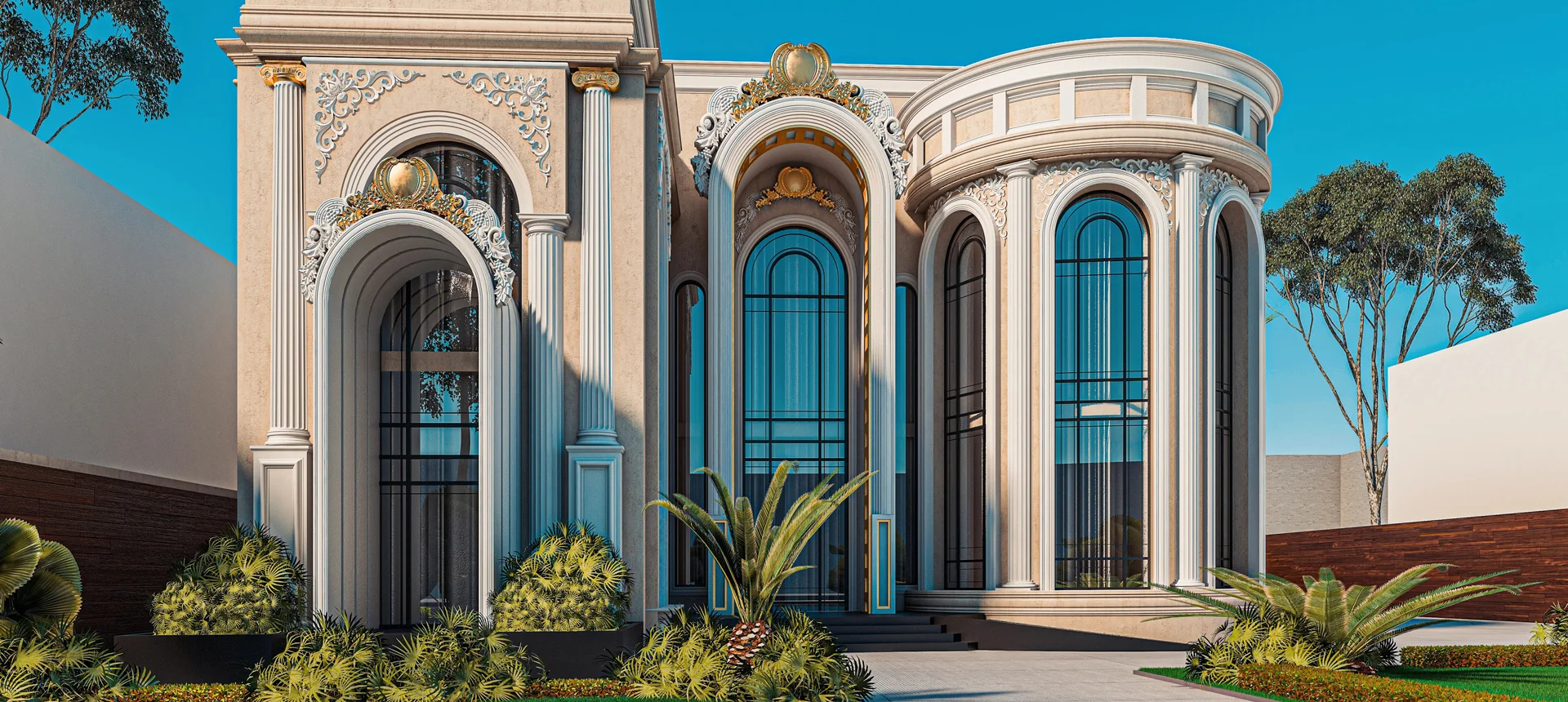Balancing the ornate classical style with modern construction standards was a major challenge. The extensive use of large arched glass windows required precise structural planning, while privacy and natural lighting needed careful attention. Additionally, the landscaping had to complement the villa’s monumental architecture without overwhelming the design.
