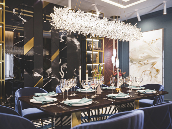 The team approached the project by creating a cohesive palette of textures and finishes. Gold accents were paired with bold marble walls, while soft velvet seating introduced warmth and comfort. The crystal chandelier was custom-selected to reflect light beautifully across the space, enhancing its grandeur without being too harsh. A layered lighting strategy was implemented — combining ambient, accent, and decorative lights — to establish both elegance and comfort. Every detail was carefully aligned to maintain harmony and balance.